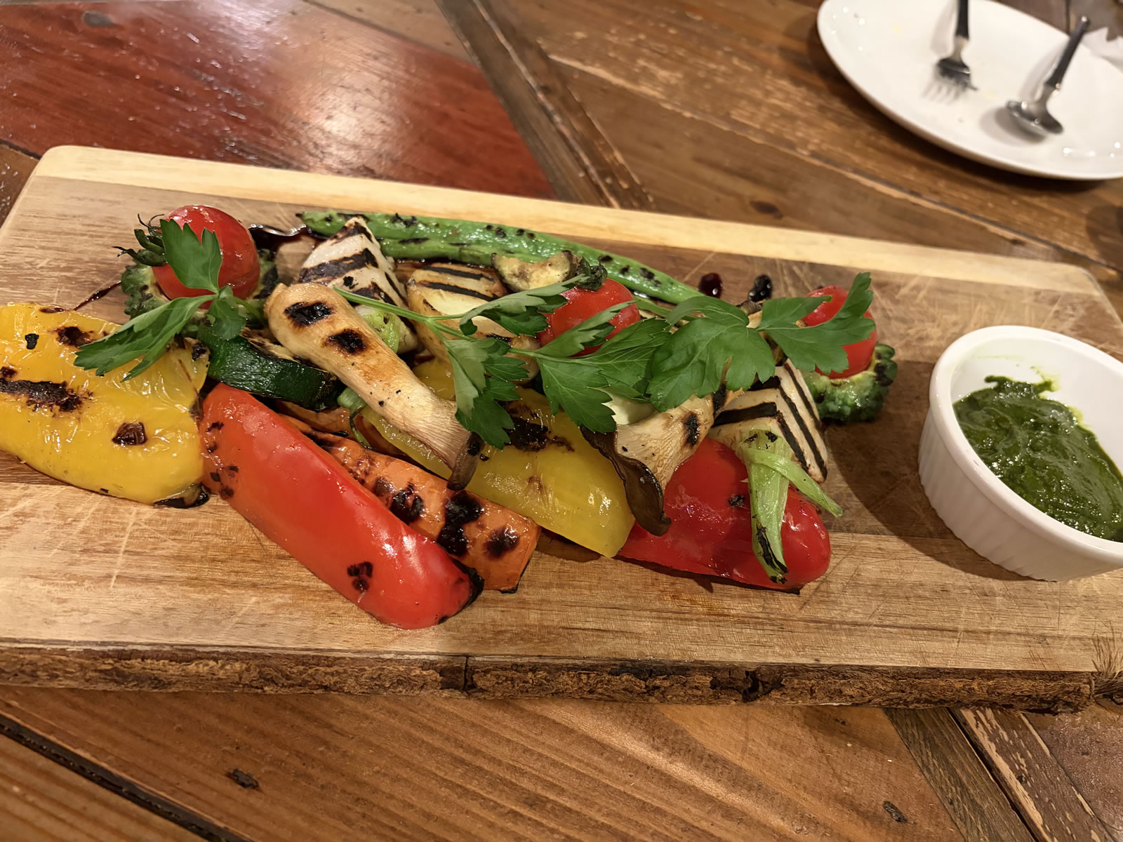 烤彩椒、蘆筍、菇類與時蔬,搭配香草醬,口味清爽,是很受歡迎的配菜。