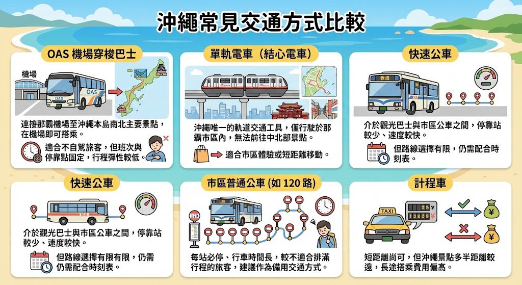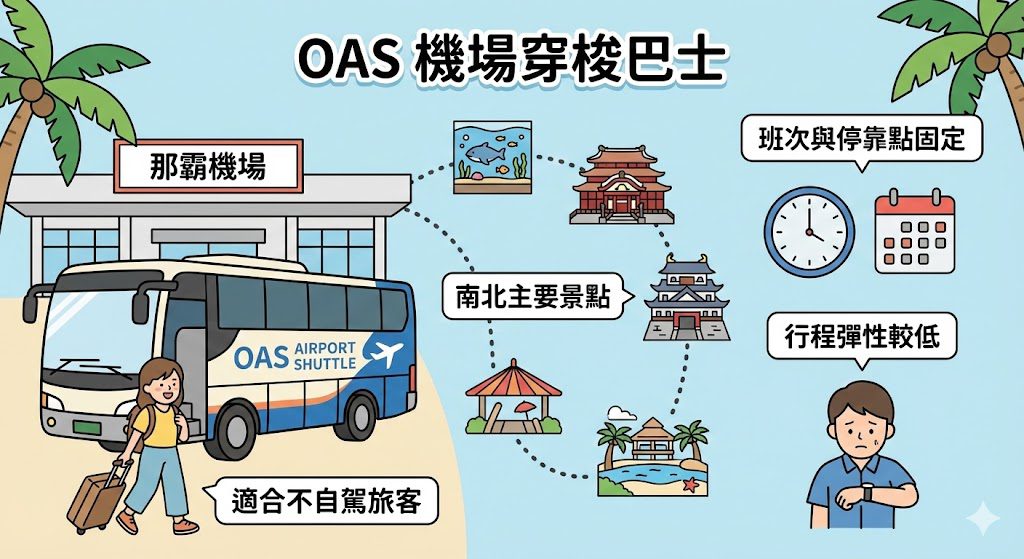 | OAS 機場穿梭巴士 | 那霸機場 ↔ 沖繩本島南北主要景點 | 機場即可搭乘、免自駕 | 班次與停靠點固定,行程彈性低 | 不自駕、行程單純旅客 |