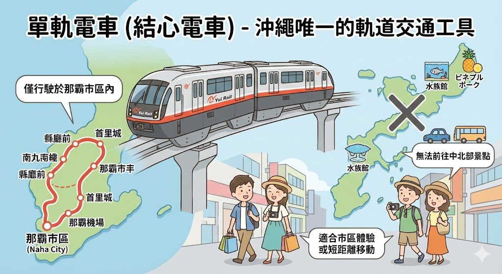 | 單軌電車(結心電車) | 僅限那霸市區 | 操作簡單、觀光體驗感佳 | 無法前往中北部景點 | 市區觀光、短距離移動 |