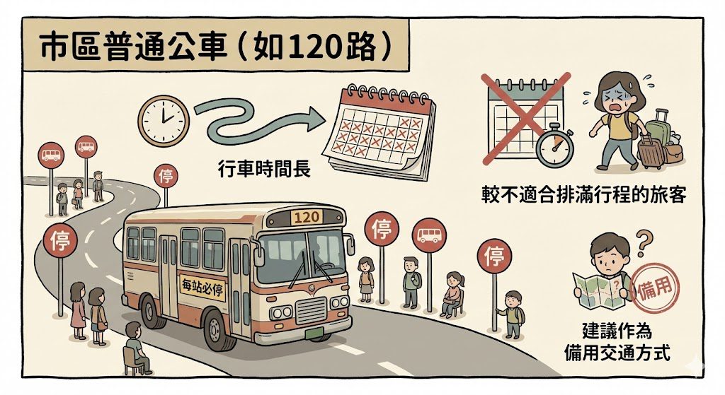 | 市區普通公車(如120路) | 市區及部分郊區 | 路線多、價格較低 | 每站必停、耗時長 | 備用交通、時間充裕旅客 |