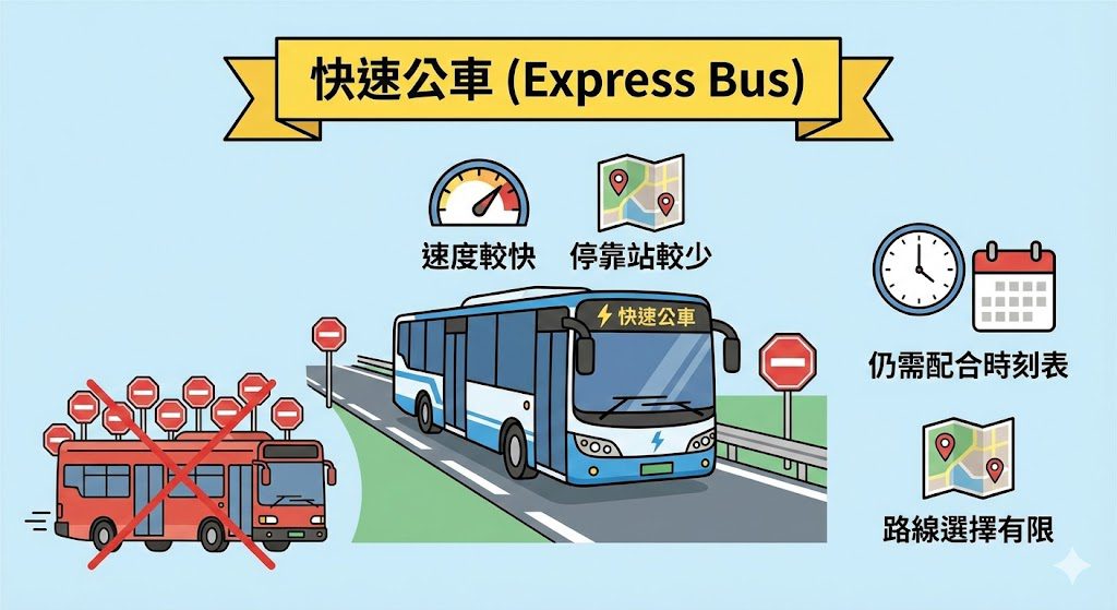 | 快速公車 | 主要觀光幹線 | 停靠站較少、速度較快 | 路線有限、需配合時刻表 | 定點移動、不趕行程者 |